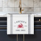 Customisez votre maison à terre ou la cuisine de la maison de plage avec cette serviette personnalisée mignonne avec votre nom de famille ou le nom de la maison et l'année établie en lettres bleu marine riche accentuée par un crabe rouge.