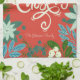 Cette belle serviette de cuisine de Noël présente des éléments floraux dessinés à la main dans différentes nuances de vert, menthe, turquoise, blanc cassé. On y trouve du pin, des fleurs, des sprigs, des feuilles, des baies ainsi que des lettres modernes en blanc cassé, lisant "Joyeux Noël". La couleur arrière - plan est un rouge traditionnel de Noël, classique. Oeuvre originale de Caroline Bonne Müller