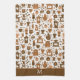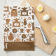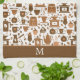 Cette mignonne serviette de cuisine a une multitude d'images graphiques relatives au café et aux gâteries de cuisine. Les images comprennent des pots de café, des tasses à vapeur, des ustensiles de cuisine, des moulins à café et des gâteries telles que des gâteaux et des glaces. La bordure marron assortie solide au fond tient votre monogramme en blanc.