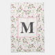 Une serviette de cuisine avec votre monogramme personnalisé initiale à l'intérieur d'un cadre blanc en coquille d'oeuf avec une bordure rose. Initial est écrit en gras. La toile de fond est un motif de fleurs sauvages roses dessinés à la main avec de longues tiges vertes et des feuilles sur une toile de fond blanche en coquille d'oeuf. Des cercles roses et des sprigs décorent également le design. Design Whimsical et joli à fleurs.