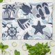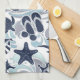 Cette serviette de cuisine dispose d'un motif d'été amusant d'éléments nautiques, y compris l'ancre, la mouette, l'étoile de mer et bien d'autres, le tout en bleu marine avec des tourbillons et des accents bleu aqua ondulé. Recherchez ID839 et ID840 pour voir d'autres produits avec cette conception et des options de couleur supplémentaires.