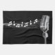 Serviette de cuisine faite sur commande noire avec une rétro illustration argentée fraîche de vecteur de microphone et des notes musicales blanches - www.vectoropenstock.com - un cadeau élégant, élégant et original pour des mélomanes.