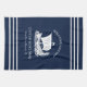 Coussin nautique en bleu marine lisant "bienvenue à bord" ainsi que votre nom et votre emplacement personnalisés dans un logo Ship.