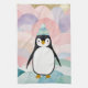 This charming illustration features a whimsical penguin centered against a backdrop of soft, overlapping semicircular hills. The palette is a gentle dreamscape of pastel pinks, lavenders, and mint greens, executed with a delicate watercolor texture that suggests a snowy, magical landscape. The penguin itself wears a cozy, patterned teal beanie, adding a touch of personality and warmth to the cool setting. Subtle gold leaf accents in the sky and on a floating celestial sphere provide a hint of fairy-tale elegance, blending minimalist character design with folk-art inspired patterns.