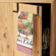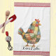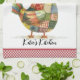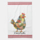 Une mignonne serviette de cuisine à thème de poulet avec patchwork coloré puis accentuée d'une bordure rouge en vichy style à carreaux. Personnalisez-le avec votre nom ou autre légende. Voir d'autres éléments de décoration de cuisine dans cette même collection de design.
