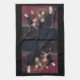 Les pattes molles sont la première chose que vous voyez sur la photo originale d'un chat calico sur cette serviette de cuisine. Le chat, principalement noir et marron, est allongé sur une couverture rouge foncé et marron contre un arrière - plan foncé, et ses pattes blanches se détachent, étalées devant elle avec au centre deux croisées l'une sur l'autre. La fourrure blanche sur sa poitrine monte jusqu'au visage, les yeux fixés sur quelque chose à travers la pièce.