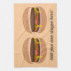 Ajoutez un slogan ou un nom pour créer un cadeau personnalisé avec un thème hamburger. L'image montre un double cheeseburger avec du fromage fondu, des anneaux de tomates et de la citrouille.