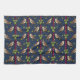 Le motif original de cette serviette de cuisine est une illustration originale de ZoeSPEAK de petits oiseaux chanteurs. Les oiseaux se font face, comme s'ils chantaient l'un contre l'autre, face à un profond arrière - plan bleu marine parsemé de minuscules étoiles jaunes. Il y a des rangées verticales de rubans rouges tourbillonnés, avec des groupes de feuilles verts entre les petits oiseaux bruns.