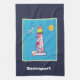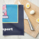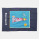 Une serviette de cuisine personnalisée sur le thème nautique. Arrière - plan bleu marine. Un cadre bleu avec une bordure jaune superposée. Un phare rayé rouge et une boule de plage, avec un soleil souriant et une mouette volante au loin positionné à l'intérieur du cadre. Personnalisez avec votre nom de famille ou un autre texte.