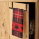 Plaque rouge et noire avec bande rouge, orignal noir et arbres.