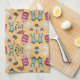 Playful kitchen-themed pattern featuring aprons, oven mitts, rolling pins, and utensils on a beige background. Cheerful and vibrant design.