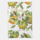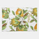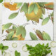 Des poires d'or entières pendent au milieu de feuilles verts aux fleurs blanches.