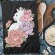 Profil d'un chat blanc avec des roses de couleur rose, lavande et pêche dans un fond noir