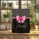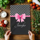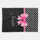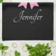 Serviettes de cuisine personnalisées avec un motif pois noir et blanc, arc rose et ruban. Pour la personnaliser, tapez votre nom dans le champ modèle. Décor de cuisine correspondant disponible au studio de design Motif Dots & Stripes.