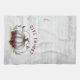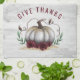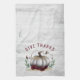 Élégante serviette de cuisine sur le thème de l'automne illustrant un citrouille blanc avec parties scintillant en faux or et fleurs rouges bordeaux. Le arrière - plan est de la texture en bois blanc. Le texte en haut dit "Merci."