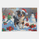 Illustration de vacances pleine de charme avec un chien gai jouant dans la neige, portant un chapeau de Père Noël et entouré de boîtes cadeaux colorées. Dans l'arrière - plan, les enfants construisent un bonhomme de neige à côté d'un sapin de Noël enneigé, créant un merveilleux pays hivernal. Parfait pour répandre la joie des fêtes et capturer la magie de Noël.