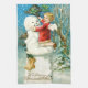 Ce bonhomme de neige et ses copains s'amusent beaucoup. Cette impression vintage de Noël représente un bonhomme de neige jouant avec un chérubin. Il a quatre trèfles à feuilles dans son casquette.