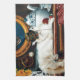 Chat steampunk en furie blanche portant son chapeau et ses lunettes de dessus marron. Le chat est assis sur un comptoir dans la cuisine du navire en attendant son heure de thé. Derrière lui se trouve la fenêtre du navire qui a une pieuvre qui passe.