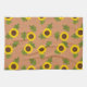 Bright and cheerful sunflower pattern design with warm earthy background and green leaves.