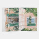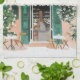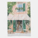 Un gouache d'un café pittoresque avec volets verts et balcon fleuri surplombe un coin salon extérieur animé. La lumière du soleil filtre à travers, invitant les clients à profiter d'un moment paisible au milieu de la verdure fleurie.