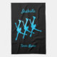 Serviette de patinage de glace personnalisée Turquoise Blue pour patinage synchronisé - un cadeau de patinage synchronisé utile pour sécher les pales après l'entraînement.Couleurs: De la glace bleue peinte sur un arrière - plan noir.Design: 3 patineurs faisant des arabesques + personnalisez avec le nom du patineur de glace + personnalisez avec le nom de l'équipe de synchro.