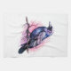 Serviette de cuisine à l'image d'un corbeau noir aux ailes violettes roses. Une aquarelle rose derrière cet oiseau mystique.