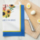 Le design coloré des serviettes de cuisine comprend centre art populaire fille ukrainienne en costume traditionnel avec de grandes fleurs de soleil et le salut national "Gloire à l'Ukraine! Gloire aux héros !" en anglais et en ukrainien. Bordures bleues et jaunes du drapeau ukrainien