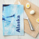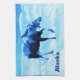 Image monochrome (bleu) d'une vache orignal marchant dans la neige. Le texte "Alaska" apparaît également. Les orignaux sont des résidents à l'année dans de nombreuses collectivités du Nord. Ici à Anchorage il y a environ 1500 animaux, ainsi que des loups, des ours bruns et d'autres animaux sauvages.Ils sont généralement bien élevés. Ils traversent souvent les rues aux passages piétons après avoir attendu un signal de marche.