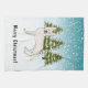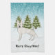 Illustration originale de Destei d'un mignon berger suisse blanc / chien de race berger allemand de couleur blanche. Le chien est placé dans une scène hivernale avec trois sapins verts et la chute de neige. L'arrière - plan est un dégradé bleu à blanc qui donne un aspect froid d'hiver. Il y a aussi une zone de texte personnalisable qui se lit maintenant : "Joyeux Noël !".