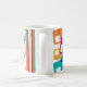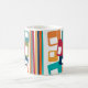 Diese Tasse hat ein modernes Design von Linien und Rechtecken in Retrotönen in Orange, Gold, Cranberry, aquamarin, grün, blau, türkis und grün.
