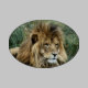 Photo ovale de forme du lion masculin africain se couchant dans les mauvaises herbes.