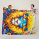 Diese Fleecedecke hat ein Löwendesign darauf.