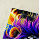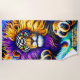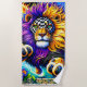 Dieses Strandtuch hat ein Löwendesign darauf.