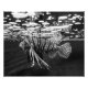 Ein LionFisch in einem Aquarium-Tank, mit einer Reflektion auf der Oberfläche des Wassers der Aufnahme. Das Bild ist schwarz und weiß.
