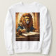 Generieren Sie ein Bild eines Löwen, der eine Brille trägt, und schreiben Sie auf ein Pergament mit einer Quill. Die Szene ist Set in einer fantastischen Welt.