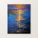 Golden light shimmers across deep blue water in an expressive, impressionistic reflection of twilight.