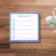 Diese Mutter, die eine Liste klebriger Notizblock zu tun, kann mit einem anderen Namen personalisiert werden. Es ist ein kleines, viereckiges, 3x3 klebriges Notizblock mit blauen und lila Texttönen auf weißem Hintergrund. Es gibt eine Pseudo funkelnd lila und blaue Grenze. Sie können den Text, der "To Do List" enthält, zu einem anderen Listentyp ändern, wenn Sie möchten. Es gibt neben jeder Zeile ein Feld für Karo, das bei jedem Vorgang angekreuzt werden kann. Behalt es einfach mit nur 5 Sachen zu tun!