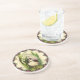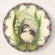 Sandstein-Untersetzer mit einem Vintage-Bild, das einen kleinen Vogel mit weißer und schwarzer Färbung zeigt, wie ein Finch oder ein Gebirgstich, umgeben von Blätter und Blume.