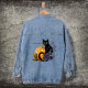 Eine schwarze Katze mit Kürbis, Kerze und lila Rose.