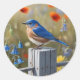 Ein zarter kleiner Blauer Vogel ist anmutig auf einem verwitterten alten Zaunpfosten in einem Feld von wunderschönen wilden Blume hochgezogen. Dieser kleine Vogel ist ein Symbol für Freiheit, Ruhe und die einfachen Freuden der Landschaft, und diese Szene fängt die zeitlose Harmonie zwischen Wildnis und Natur ein.