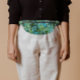 Stilvolles Fanny Pack für unterwegs und mit einem Foto von kleinen, blauen Brunnera-Blume und Blätter. Die Rückseite des Fanny Pack ist schwarz.
