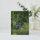 Ein originelles Foto eines kleinen blauen Helden, der nach seinem Abendessen in einem kleinen Teich sucht, umgeben von Iris-Blättern.