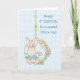 Ein besonderer kleiner Junge verdient eine besondere Osterkarte, vor allem wenn es sein erster ist! Ein Lieblingshasen sitzt auf einer Schaukel von Blume mit hellblauem Hintergrund.