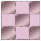 Dieses wunderschöne Kinderzimmer ist mit pastellrosa und lila Quadraten ausgestattet, die ein Quiltmuster bilden. Die Quadrate sind mit einem rosa und lila seidigen Band umrissen.