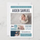 Erschwingliche, individuell bedruckte Fotokarten für die Geburtshilfe. Dieses moderne minimalistische Design verfügt über ein 3-Foto-Collage-Layout mit blauen Farbblöcken, das durch die Farbänderung der Hintergrundfarbe in eine beliebige Farbe angepasst werden kann. Personalisieren Sie es mit Babynamen und Geburtsdaten und Ihren Fotos. Auf der Rückseite befindet sich ein niedliches, handskizziertes Muster, oder Sie können das Leerzeichen verwenden, um bei Bedarf zusätzliche Fotos und Texte hinzuzufügen. Klicken Sie auf Anpassen, um Hintergrundfarben auszuwählen, mehr Fotos hinzuzufügen und Textfarben und Schriftart anzupassen, um eine einzigartige Kindergeburtsanktion für Ihr Neugeborenes zu erstellen.