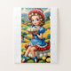 Kleine Miss Muffet sitzt auf einem Tuffet in einem zauberhaften, pastoralen Rahmen. Sie trägt ein blaues Kleid mit weißer Schürze und Schnittwange, rote Schuhe und ihre lockigen Haare flüchtige Blick unter einer Motorhaube. Der Hintergrund umfasst sanfte Hügel, Fliesen, Bauernhäuser und den klaren Himmel.
