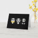 Zwei kleine Pandas sitzen im Dunkeln mit einem kleinen Skelett. Ein Panda trägt ein gelbes T-Shirt mit dem Wort "meh" darauf.