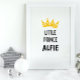 Dieses individuelle Name-Poster zeigt eine süße Abbildung einer Krone und eines kleinen Prinzwortes, und der individuelle Name wird in einem stilvollen Schriftart prominent dargestellt. Es ist die perfekte Art, den Namen und die einzigartige Persönlichkeit Ihres Kindes zu feiern.
