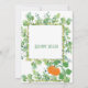 "Ein kleiner Kürbis ist auf dem Weg", die Herbst/Herbst-Kinderdusche für Ihre Gäste. Wow sie mit der üppigen Vegetation und dem lebhaften Orangenkürbis. Das Design besteht aus Herbstblättern, einem rechteckigen grünen Kranz und einem orangefarbenen Kürbis, um die Farben des Herbstes zu feiern. Die Illustration verwendet moderne Skripte und Typografie, die leicht angepasst werden können. Die Rückseite weist ein passendes Design auf.