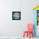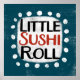 Ein niedliches typografisches Design, das "Little Sushi Roll" sagt. Es ist schwarz und rot auf einem weißen Rechteck mit funky, spielerisch weißen Punkten, die ihn umgeben, alles auf einem aquamarinen Hintergrund.